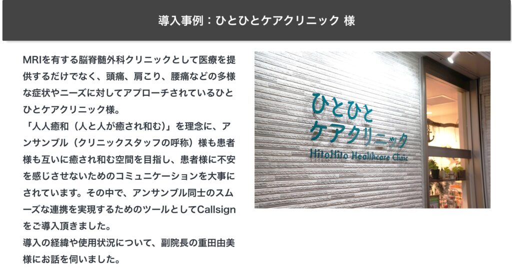 ひとひとケアクリニックでの院内コミュニケーションで活用しているSony「Callsign」の導入事例が紹介されました。